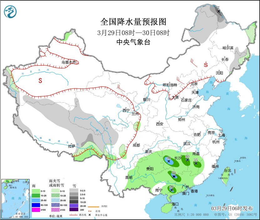 3月29日8時至30日8時,內(nèi)蒙古東北部、黑龍江西北部和東部、吉林東部、西藏東部、青海西部等地部分地區(qū)有小到中雪或雨夾雪,其中,黑龍江西北部部分地區(qū)有大雪(5~7毫米)。湖南西部和東部、江西中南部、廣西東部、廣東中西部等地部分地區(qū)有中到大雨,其中,廣西東北部部分地區(qū)有暴雨(50~70毫米)。內(nèi)蒙古東南部和西北部、河北北部等地部分地區(qū)有4~6級風。