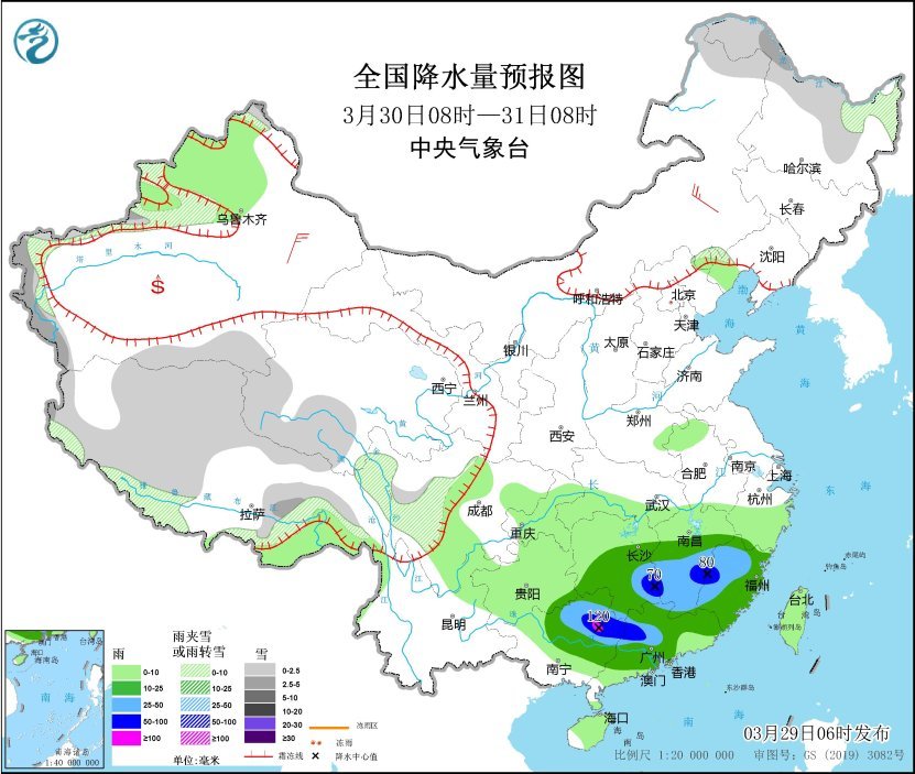 3月30日8時至31日8時,黑龍江北部、新疆南疆高海拔山區(qū)、西藏大部、青海西部、川西高原南部等地部分地區(qū)有小到中雪或雨夾雪。湖南中南部、江南中南部、福建大部、廣西西北部、廣東大部等地部分地區(qū)有中到大雨,其中,湖南東南部、江西西南部和東部、福建西部、廣西東北部、廣東西部等地部分地區(qū)有暴雨或大暴雨(100~120毫米)。內(nèi)蒙古東南部、新疆東部等地部分地區(qū)有4~5級風。