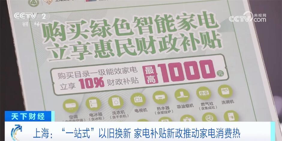 央視網(wǎng)消息:日前,國務(wù)院印發(fā)《推動(dòng)大規(guī)模設(shè)備更新和消費(fèi)品以舊換新行動(dòng)方案》,明確實(shí)施消費(fèi)品以舊換新行動(dòng)。上海市從3月30日起實(shí)施新一輪綠色智能家電消費(fèi)補(bǔ)貼政策,對(duì)16大類一級(jí)能效家電產(chǎn)品進(jìn)行補(bǔ)貼,各大商超賣場(chǎng)也推出“一站式”以舊換新、延伸局部改造等補(bǔ)貼及服務(wù)。