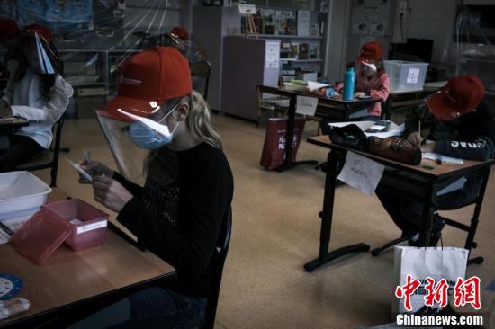 當(dāng)?shù)貢r(shí)間5月12日,法國中部圣埃蒂安附近的拉格蘭德克羅伊市,當(dāng)?shù)匦W(xué)生戴著統(tǒng)一發(fā)放的面罩上課。據(jù)報(bào)道,當(dāng)?shù)貢r(shí)間5月11日,法國開始逐步“解封”,結(jié)束已經(jīng)持續(xù)55天的全國“封城”狀態(tài)。