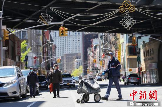 當(dāng)?shù)貢r(shí)間5月12日,紐約曼哈頓唐人街,華人郵遞員正在投遞郵件。隨著近期紐約新冠肺炎疫情漸緩,紐約華人社區(qū)街頭行人逐漸增多。