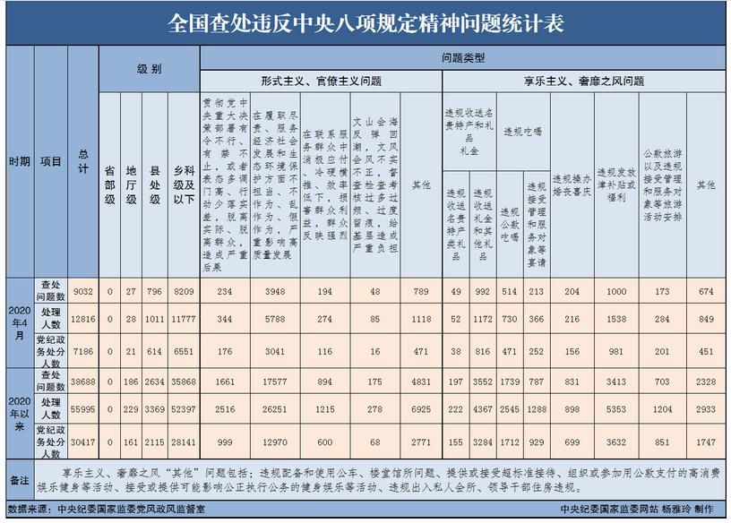 據(jù)介紹,為掌握全國貫徹落實中央八項規(guī)定精神情況,中央紀委國家監(jiān)委在各省區(qū)市和新疆生產建設兵團、各中央和國家機關、各中央企業(yè)和中央金融企業(yè)等建立了落實中央八項規(guī)定精神情況月報制度。2020年以來,截至4月30日,全國查處違反中央八項規(guī)定精神問題情況如下: