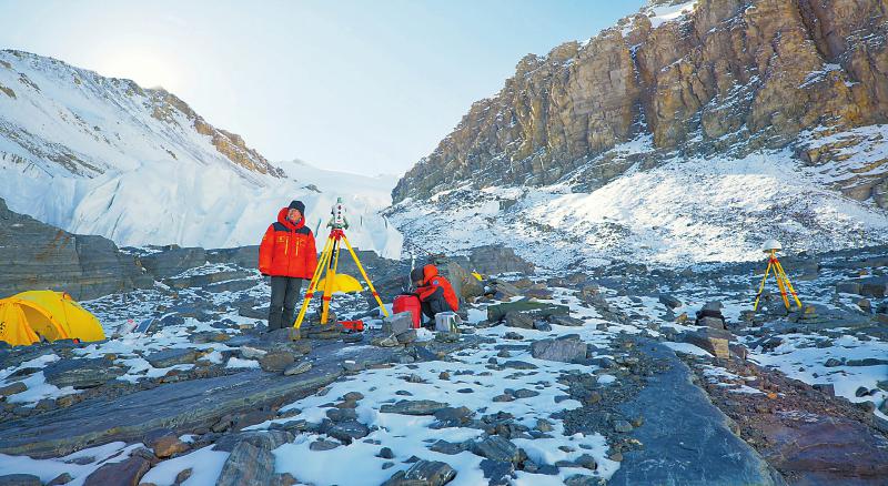 更多測繪人的日常被記錄下來。史志剛,重力測量組組長,除完成珠峰地區(qū)加密重力測量之外,他還完成海拔5200米至6000米所有6個(gè)交會(huì)點(diǎn)的重力測量,成為本次珠峰高程測量項(xiàng)目中,唯一一個(gè)走遍所有交會(huì)測量點(diǎn)的人。王戰(zhàn)勝,在本次珠峰高程測量中負(fù)責(zé)高程導(dǎo)線、GNSS測量和東絨3點(diǎn)的交會(huì)測量工作。他攀冰跨河,4次到達(dá)海拔最高的東絨3交會(huì)點(diǎn)。鄭林,大本營交會(huì)測量組組長,帶著年輕隊(duì)員武光偉克服了距離峰頂遠(yuǎn)、交會(huì)測量難度大的困難,完成珠峰大本營的交會(huì)測量及基準(zhǔn)站值守工作……