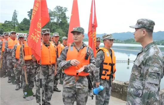 下午15時(shí),大竹縣烏木水庫大堤上,200余名預(yù)備役官兵身著橘色救生衣集結(jié)完畢,應(yīng)急分隊(duì)的紅旗迎風(fēng)招展,機(jī)關(guān)各科協(xié)調(diào)的保障力量也源源不斷往集結(jié)地域開進(jìn)。15時(shí)20分,應(yīng)急分隊(duì)已到達(dá)指定地域,救援物資全部到位。