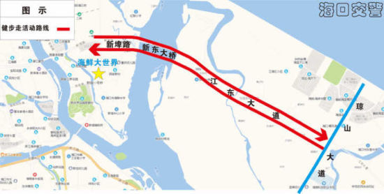 路線:海鮮大世界(起點(diǎn)和終點(diǎn)) 新埠路 新東大橋 江東大道(江東大道與瓊山大道交叉口)。