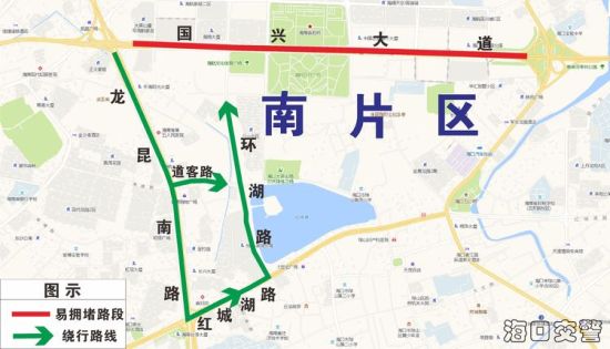 (2)龍昆南路→紅城湖路(道客路)→環(huán)湖路進(jìn)入國(guó)興大道南片區(qū)。