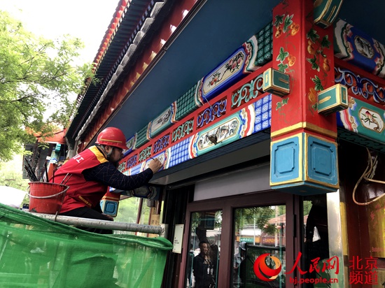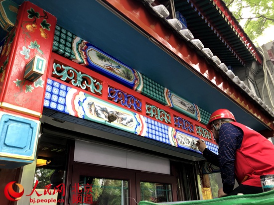 人民網(wǎng)北京5月14日電(池夢蕊)初夏時(shí)節(jié),北京南池子大街、北池子大街和東華門大街上綠樹成蔭。建設(shè)者們在街道兩側(cè)的小型圍擋內(nèi)忙碌著,對著一處處木門、門頭、外墻、屋檐和門廊彩繪如切如磋、如琢如磨。