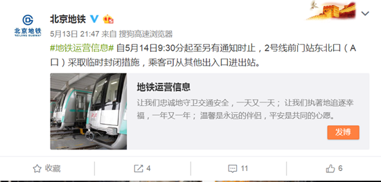 地鐵2號(hào)線前門(mén)站A口今日9:30起臨時(shí)封閉