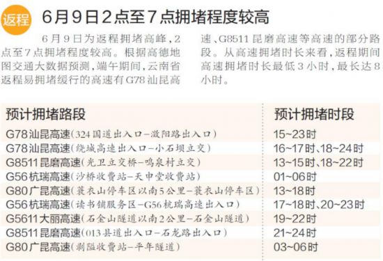 從收費站擁堵情況看,6月7日-9日,預(yù)計較為擁堵的收費站主要是勝境關(guān)收費站、小喜村收費站、河口收費站、昆明收費站。其中勝境關(guān)收費站擁堵時長達(dá)2.7小時,車速為14公里/小時。