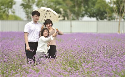 七彩花田總面積約5.6萬平方米,采用宿根花卉、草本花卉間種的形式,可實現(xiàn)春、夏、秋三季均有花可觀。昨天記者在現(xiàn)場看到,7000平方米的紫色馬鞭草成片盛開,風吹花浪起伏。據(jù)相關負責人介紹,七彩花田是空港生態(tài)綠廊項目的重要組成部分。目前,保稅區(qū)已建成公共綠地1020萬平方米。(文/記者 戰(zhàn)旗 圖/記者 賈磊)