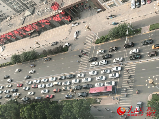 6月12日上午8時許,正值上班高峰期,石家莊市區(qū)主干道裕華路上,人多車多。裕華路與體育大街交口往東,北側是劍橋春雨小區(qū),南側是方北小區(qū),兩個小區(qū)門口正對裕華路的半幅機動車道上分別畫著斑馬線。因為附近有學校,南北兩側陸陸續(xù)續(xù)有送孩子的家長或騎車人從斑馬線通過裕華路。每當有人通過斑馬線時,裕華路上的汽車都會停下來等候。由于行人三五成群,不斷通過,路上的汽車不得不繼續(xù)等候,以至于排起了長龍。