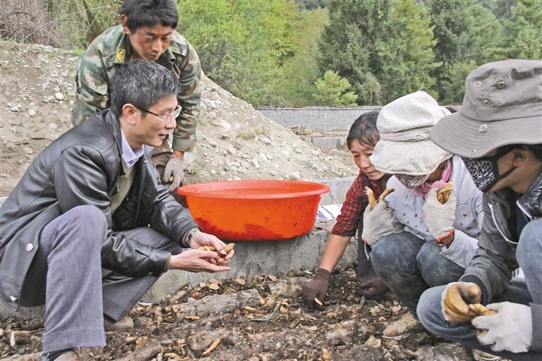 廣東省第七批援藏工作隊(duì)成員肖國(guó)鑫(左一)在波密縣指導(dǎo)當(dāng)?shù)剞r(nóng)牧民種植天麻。