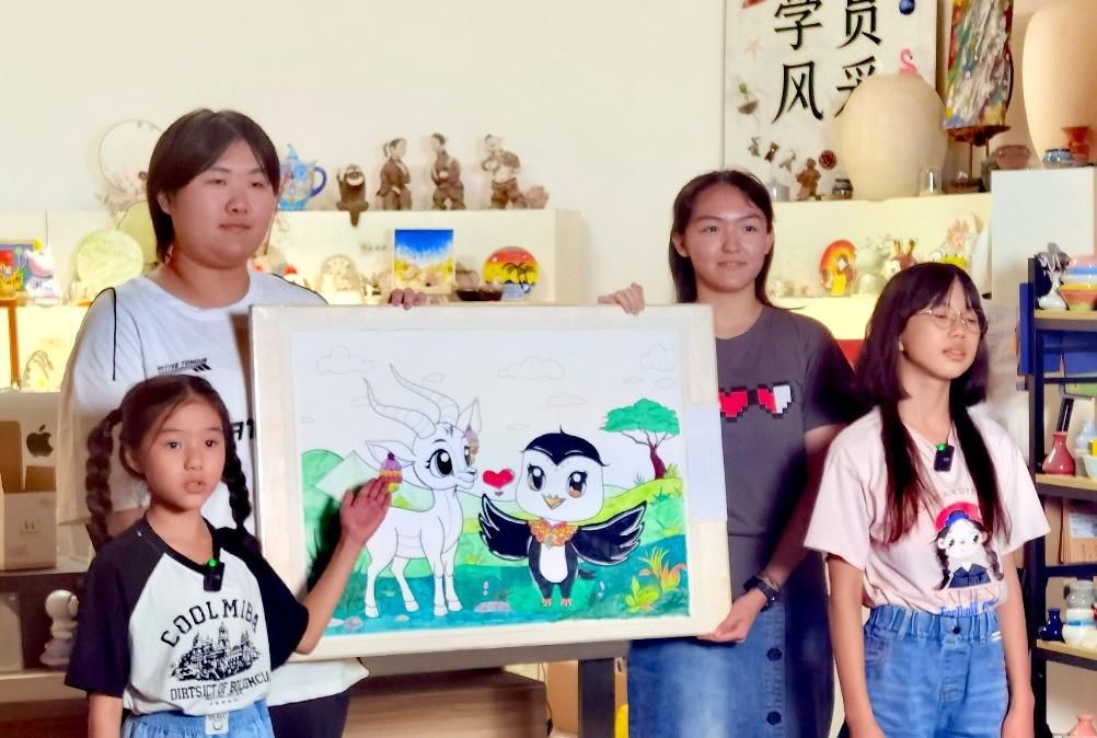 活動(dòng)期間,北京的劉心語、吳梓菡、文藝、吳辰希與西藏的旦增雍措、旦增尼瑪、徐杰、索朗央珍等兩地青少年代表,通過“同繪一幅畫”的方式,將西藏的藏羚羊與北京的雨燕巧妙地融合在一個(gè)畫面之中。畫作中,一邊是象征北京自由與活力的“空中旅行家”雨燕在無邊的藍(lán)天中翱翔,另一邊則是代表西藏堅(jiān)韌與生機(jī)的藏羚羊在遼闊的無人區(qū)自由奔跑。盡管兩者習(xí)性迥異、棲息地不同,它們共同展現(xiàn)了自由無束的特質(zhì),寓意著京藏兩地青少年盡管生活在不同的文化環(huán)境中,卻都能追求自由和快樂的成長(zhǎng)。正如北京的孩子們說:“我們把來自拉薩的藏羚羊和來自北京的小雨燕聚集到一起,畫在了一個(gè)畫面中??矗翰亓缪虼髦刈宥?,小雨燕身著云領(lǐng)服飾,她們是盛裝出席啊。就像我們,北京和西藏的同學(xué)們,手拉著手,心連著心,書信往來,學(xué)習(xí)探究,相互幫助,一起成長(zhǎng)?!蔽鞑氐暮⒆诱f:“我們就像畫中的藏羚羊和北京雨燕一樣,心手相牽,互相鼓舞,用積極的態(tài)度學(xué)習(xí)、生活,成為祖國的好少年!”。