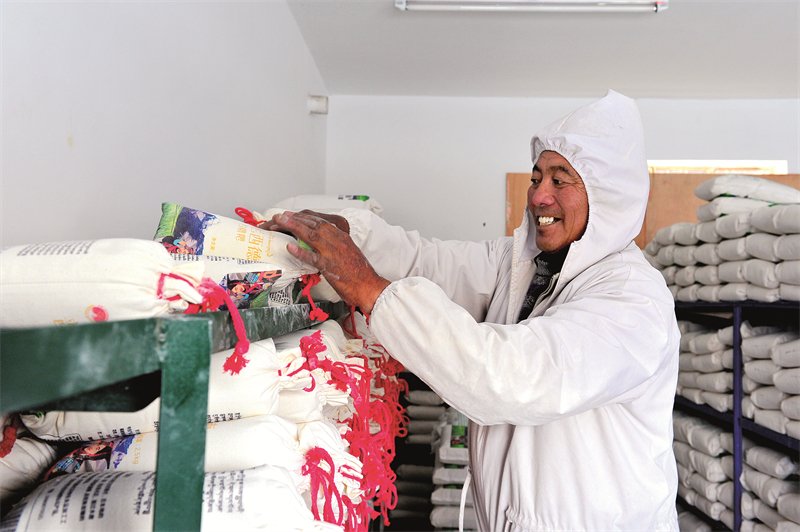 巴桑次仁將生產(chǎn)好的糌粑擺放入庫。溫凱 攝