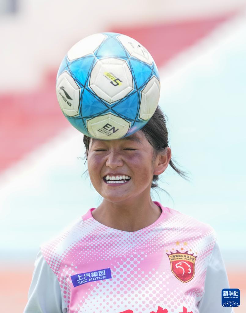 在西藏日喀則市上海實(shí)驗(yàn)學(xué)校操場上,“珠峰雪鷹”女子足球隊(duì)隊(duì)員旦增央金在訓(xùn)練頭球(9月3日攝)。
