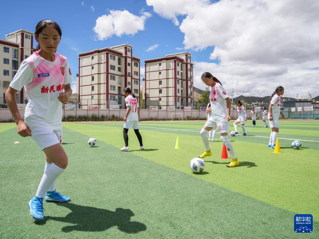 在西藏日喀則市上海實(shí)驗(yàn)學(xué)校,“珠峰雪鷹”女子足球隊(duì)隊(duì)員們在操場上訓(xùn)練(9月3日攝)。