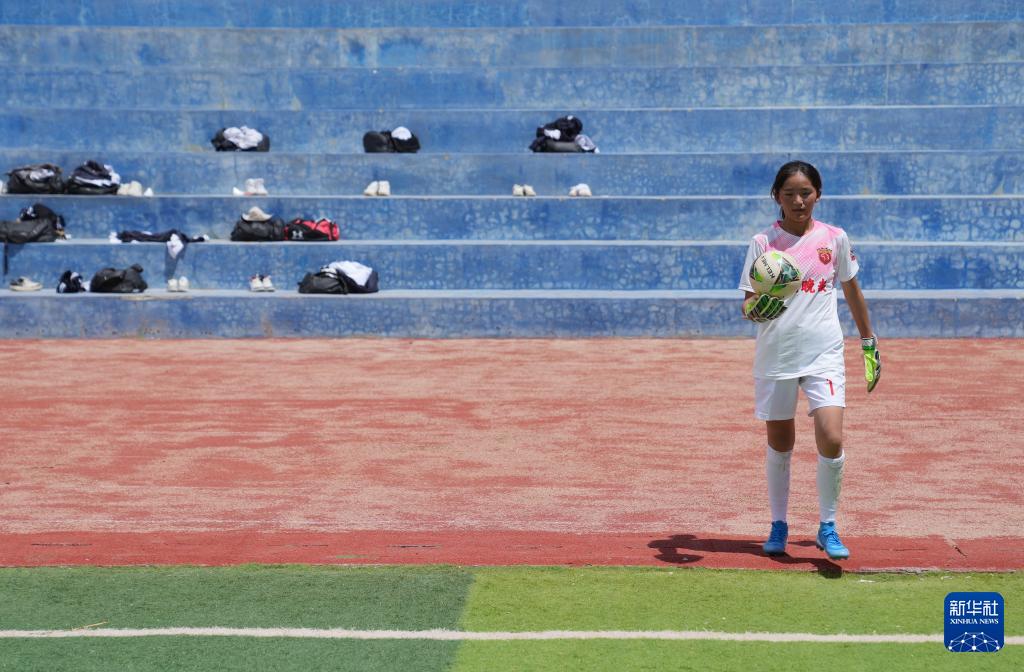 在西藏日喀則市上海實(shí)驗(yàn)學(xué)校,“珠峰雪鷹”女子足球隊(duì)守門員邊普在操場上訓(xùn)練(9月3日攝)。