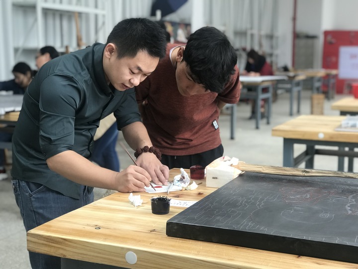 2018年,仁青郎加(右)跟老師學(xué)習(xí)漆畫(huà)技法。(受訪者供圖)