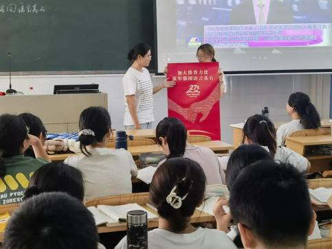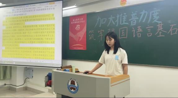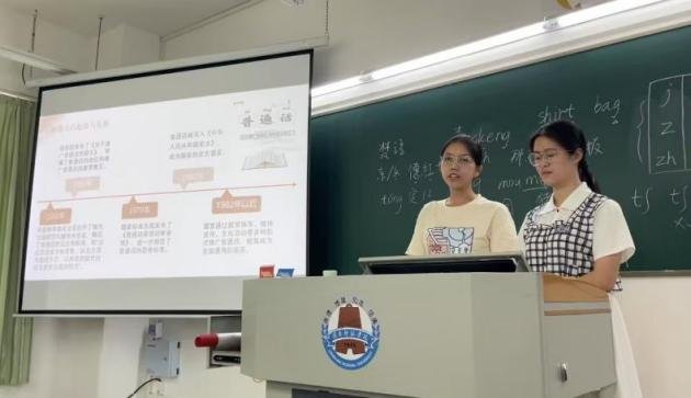 新學(xué)期伊始,《教師語言》課程教學(xué)團隊將推普宣傳與課程的“音韻筑基”內(nèi)容相結(jié)合,理論層面講解我國通用語言文字的相關(guān)法律政策和普通話聲、韻、調(diào)等基礎(chǔ)知識;實踐層面指導(dǎo)學(xué)生利用中國語言文字?jǐn)?shù)字博物館、師圈小程序等課程資源進(jìn)行學(xué)習(xí),邀請學(xué)生介紹普通話的發(fā)展歷程和我國第27屆推普宣傳主題中所滲透的“強國必須強語,強語助力強國”價值內(nèi)涵。