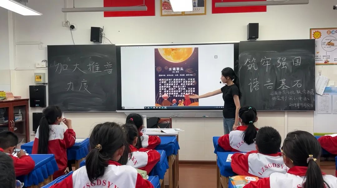 21級實習(xí)生戴鈺瑩在湛江市第四小學(xué)舉辦推普活動,將紅色經(jīng)典與傳統(tǒng)文化教育相結(jié)合,通過誦讀《西江月·井岡山》和《三字經(jīng)》,讓學(xué)生感受到革命先烈的英勇無畏,傳承了中華民族的傳統(tǒng)美德與智慧,增強了文化自信與民族自豪感。