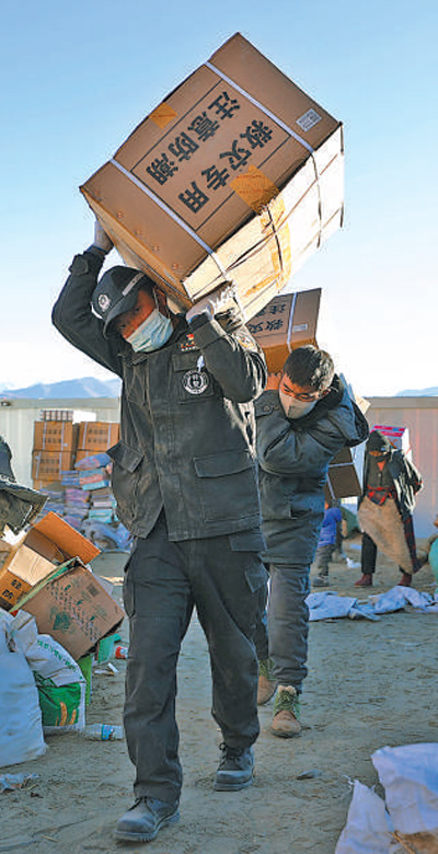 1月10日,日喀則市特警在古榮村安置點(diǎn)同受災(zāi)群眾一起搬運(yùn)物資。人民日?qǐng)?bào)記者 張武軍攝