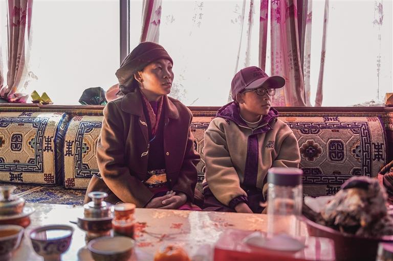 當(dāng)日,天空晴朗,在廣袤無(wú)垠、無(wú)樹(shù)木遮擋的曠野上,稍起一陣疾風(fēng),便會(huì)揚(yáng)起一層薄薄的黃沙。從村委會(huì)出發(fā),沿著冰湖畔的水泥小路前行,很快就來(lái)到了村民倫珠曲珍的家。一進(jìn)屋,厚實(shí)的木門(mén)便將凜冽的寒風(fēng)擋在了門(mén)外?!翱煺?qǐng)進(jìn),這幾天風(fēng)沙有點(diǎn)大,普莫雍措都沒(méi)以前藍(lán)了?!眰愔榍湟贿呹P(guān)門(mén)一邊熱情地笑著說(shuō)道。