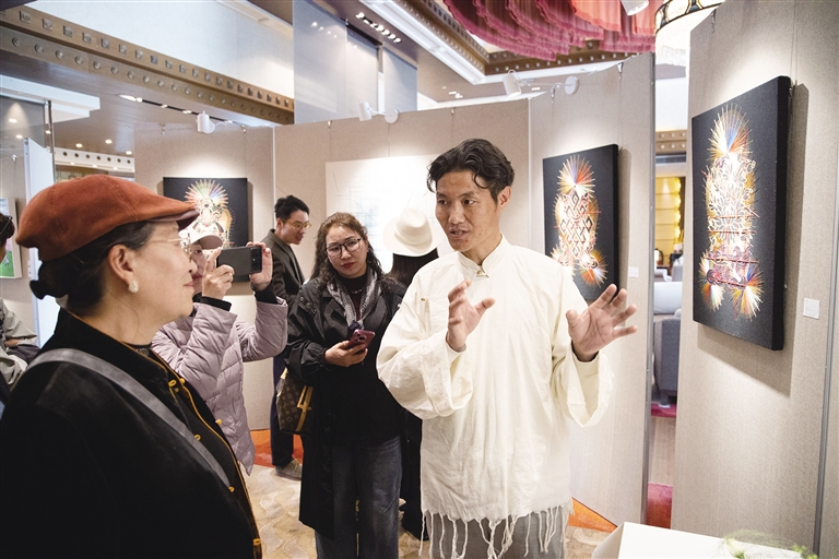 5月2日,“三國同框 四季如畫 五彩亞東——亞東縣文化交流及特色產(chǎn)品展銷活動”在拉薩香格里拉酒店開幕。亞東當?shù)氐牟刈逅囆g家索喃次仁攜手多位區(qū)外藝術名家,以桃花為媒,通過藝術作品展現(xiàn)邊境名城亞東的獨特魅力,以及各族群眾如桃花綻放般團結共進、共建美好家園的生動圖景,更映照出新時代邊陲亞東的繁榮新貌。