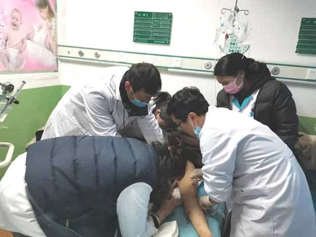 援藏醫(yī)療隊(duì)快速分工,組成新生兒復(fù)蘇團(tuán)隊(duì)。呼吸球囊尚未到位,孫豐濤毫不猶豫地為孩子實(shí)施口對口人工呼吸。徐鴻宇立即給予“雙拇指環(huán)繞法”胸外心臟按壓,縣醫(yī)院婦產(chǎn)科醫(yī)護(hù)人員積極協(xié)助。斷臍處理后,迅速將孩子移至暖臺保暖,繼續(xù)胸外心臟按壓、呼吸球囊面罩輔助呼吸。經(jīng)過分秒必爭的搶救,孩子心跳恢復(fù),全身皮膚轉(zhuǎn)紅潤,但呼吸和反應(yīng)仍然不好。經(jīng)過與家屬溝通,徐鴻宇給予氣管插管,繼續(xù)人工輔助通氣,并將孩子轉(zhuǎn)往上級醫(yī)院繼續(xù)治療。在此期間,產(chǎn)婦胎盤順利娩出,生命體征平穩(wěn)。