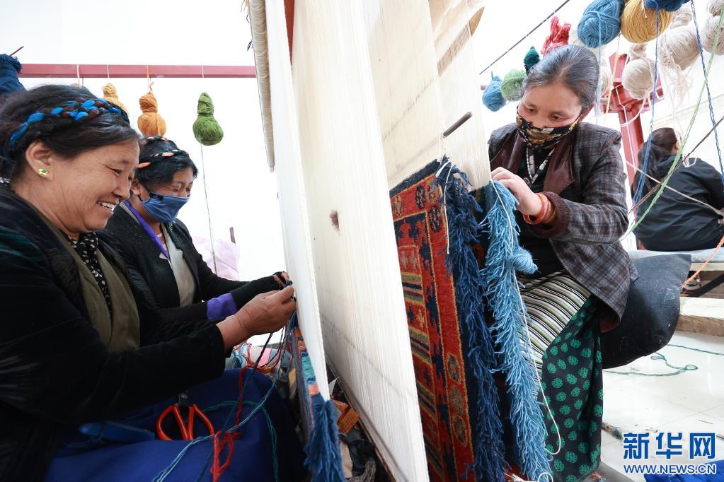 山南市瓊結(jié)縣農(nóng)牧民在襄陽援藏工作隊(duì)引進(jìn)的西藏薩喜欽布公司編織藏毯(2021年6月18日攝)。(受訪者供圖)