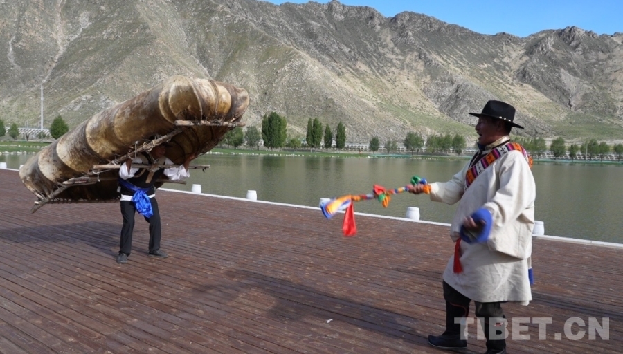 圖為廓孜國(guó)家級(jí)非遺代表性傳承人拉巴次仁(右)和師弟羅布(左)跳廓孜舞(牛皮船舞) 攝影:王茜