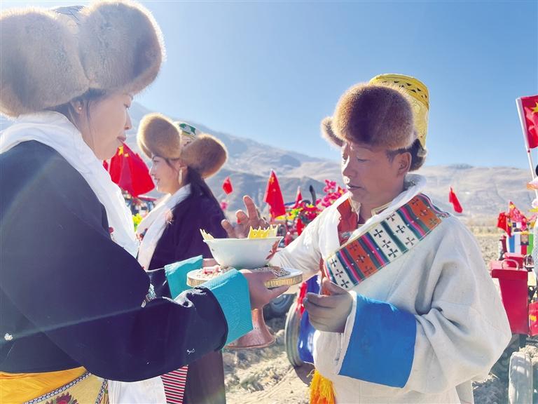 在克松村的田地旁,村民將拖拉機(jī)裝扮成“鐵?!保貌貞蛎婢?、彩色瓔珞等“打扮”一番,插著彩旗格外好看。村民還獻(xiàn)上哈達(dá)與自家釀的青稞酒給犁手、撒種子的姑娘和“鐵牛”,就開始了新春第一犁。