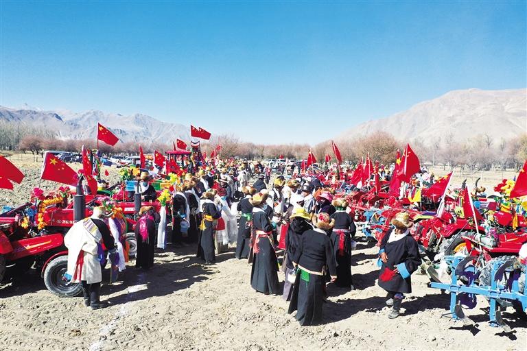 又是一年春耕季,3月16日,天氣晴朗、陽(yáng)光明媚,記者一大早出發(fā)去山南市乃東區(qū)昌珠鎮(zhèn)克松村和拉薩市達(dá)孜區(qū)塔杰鄉(xiāng)巴嘎雪村參加春耕儀式。還沒走近田間,遠(yuǎn)遠(yuǎn)地就能看到鮮艷的五星紅旗、被裝扮成“鐵牛”的拖拉機(jī)、身著節(jié)日盛裝的群眾……他們齊聚在田間地頭等待著開啟春耕第一犁。
