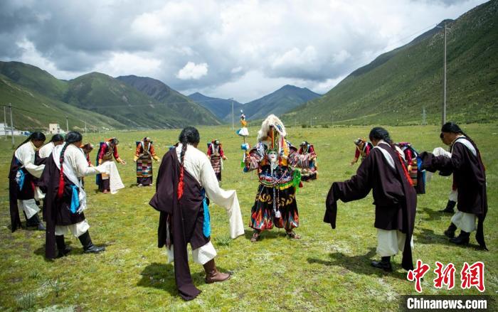 盛夏的西藏自治區(qū)拉薩市墨竹工卡縣門巴鄉(xiāng)仁多崗村草地上,28歲的尼瑪與身著盛裝的藏族牧民們跳著國(guó)家級(jí)非物質(zhì)文化遺產(chǎn)直孔普堆巴宣舞,迎接遠(yuǎn)道而來的游客,動(dòng)作優(yōu)美的歌舞吸引了大家駐足觀賞,并用手機(jī)或相機(jī)記錄。
