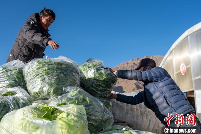 圖為當(dāng)?shù)剞r(nóng)牧民轉(zhuǎn)運剛采摘的大棚蔬菜前往日喀則市區(qū)?!〗w波 攝