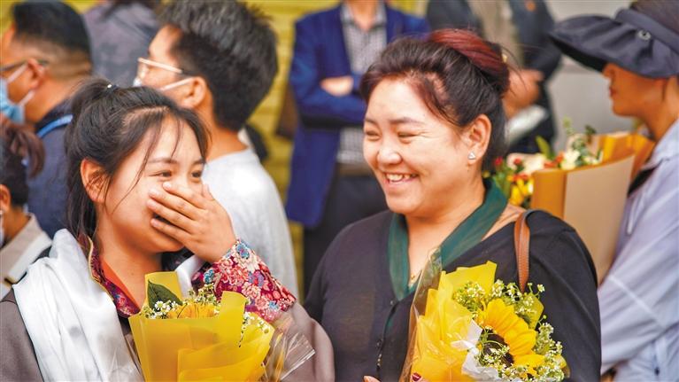 圖為家長(zhǎng)為結(jié)束高考的考生送上鮮花。 記者 平措次仁 攝