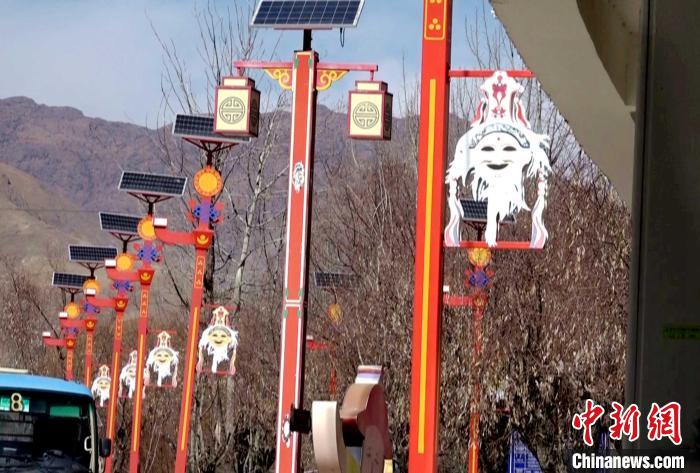圖為扎西曲登社區(qū)藏戲元素路燈。貢桑拉姆 攝