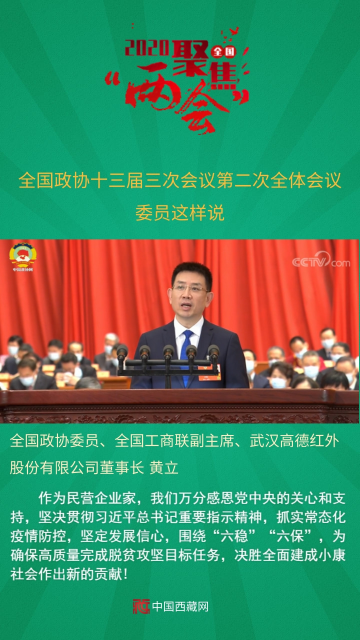 全國政協(xié)委員、全國工商聯(lián)副主席、武漢高德紅外股份有限公司董事長黃立發(fā)言說,作為民營企業(yè)家,我們?nèi)f分感恩黨中央的關(guān)心和支持,堅(jiān)決貫徹習(xí)近平總書記重要指示精神,抓實(shí)常態(tài)化疫情防控,堅(jiān)定發(fā)展信心,圍繞“六穩(wěn)”“六?!?,為確保高質(zhì)量完成脫貧攻堅(jiān)目標(biāo)任務(wù),決勝全面建成小康社會(huì)作出新的貢獻(xiàn)!