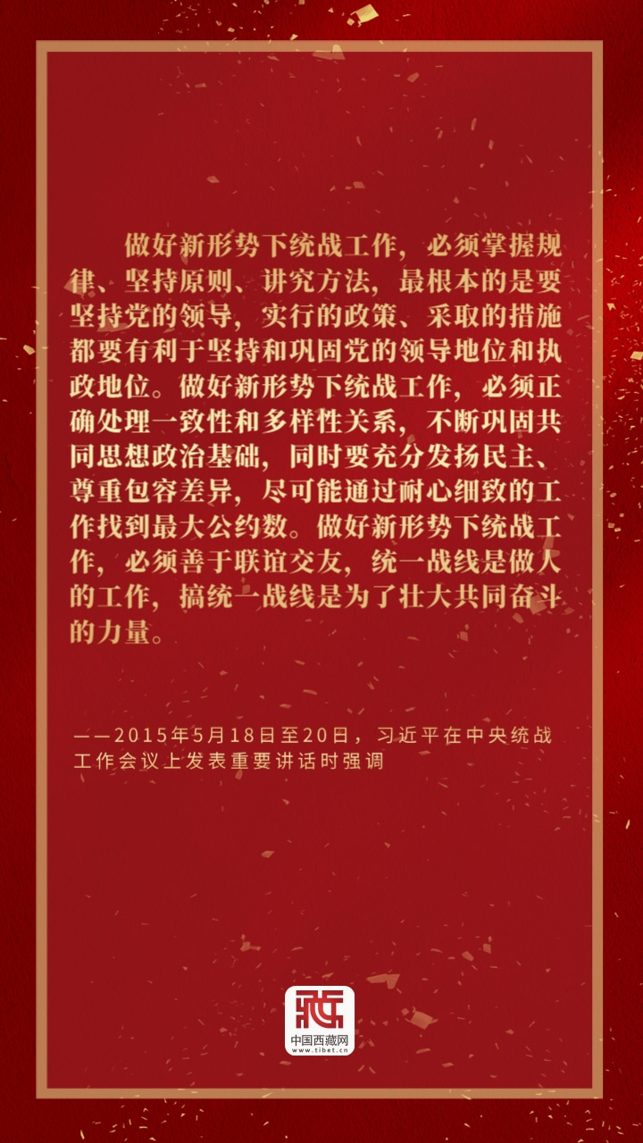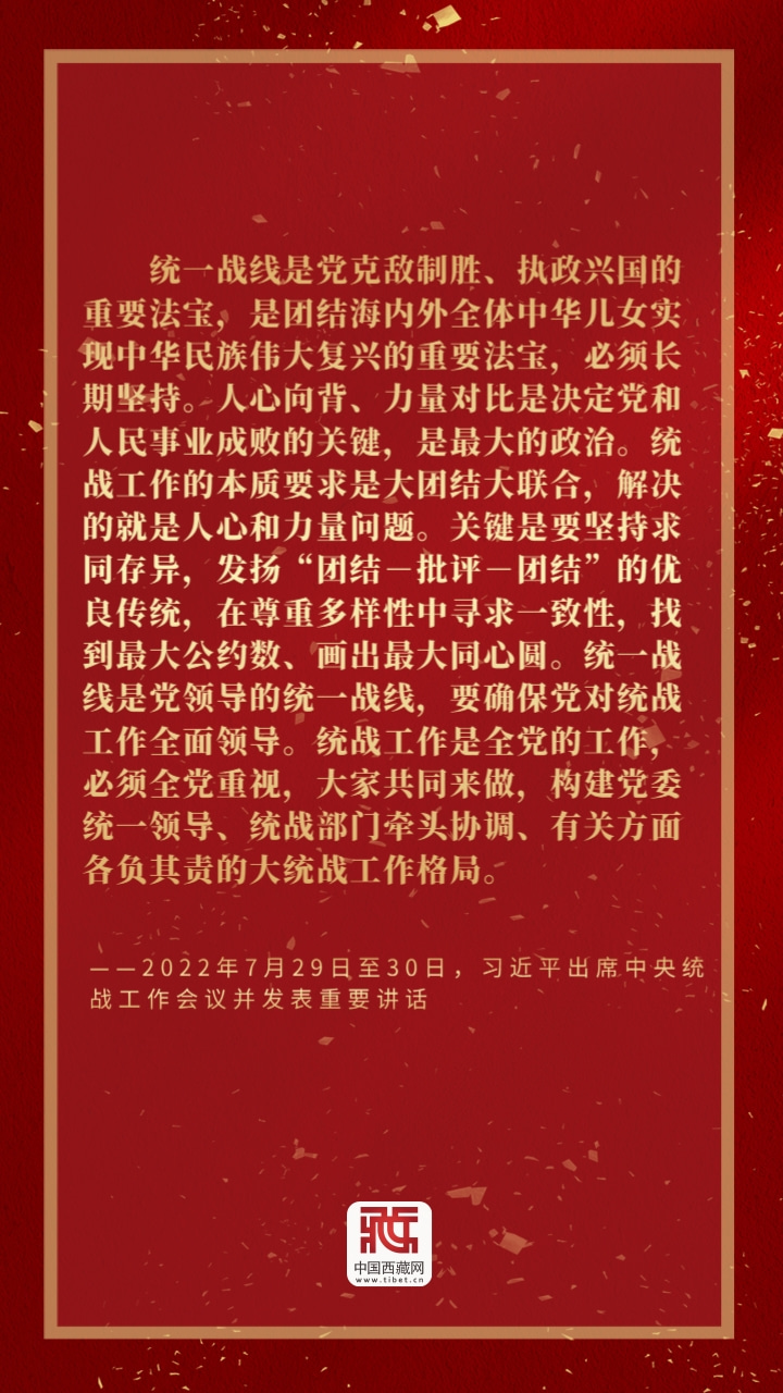 統(tǒng)一戰(zhàn)線是中國(guó)共產(chǎn)黨在中國(guó)革命中戰(zhàn)勝敵人的一個(gè)重要法寶。黨的十八大以來,以習(xí)近平同志為核心的黨中央把統(tǒng)一戰(zhàn)線和統(tǒng)戰(zhàn)工作擺在全黨工作的重要位置,努力團(tuán)結(jié)一切可以團(tuán)結(jié)的力量、調(diào)動(dòng)一切可以調(diào)動(dòng)的積極因素,畫出最大同心圓,為黨和人民事業(yè)不斷發(fā)展?fàn)I造了十分有利的條件。讓我們一起品讀習(xí)近平總書記關(guān)于統(tǒng)戰(zhàn)工作的“金句”,以此為指南,凝聚團(tuán)結(jié)奮進(jìn)力量,不斷開創(chuàng)統(tǒng)戰(zhàn)工作新局面?。ㄖ袊?guó)西藏網(wǎng) 編輯/周晶 孫健 制作/歐帆)