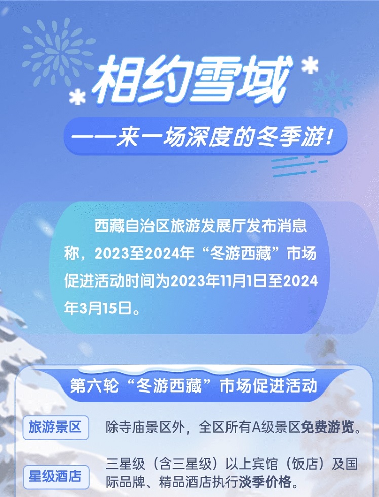 西藏自治區(qū)旅游發(fā)展廳發(fā)布消息稱,2023至2024年“冬游西藏”市場(chǎng)促進(jìn)活動(dòng)時(shí)間為2023年11月1日至2024年3月15日。[詳細(xì)] -