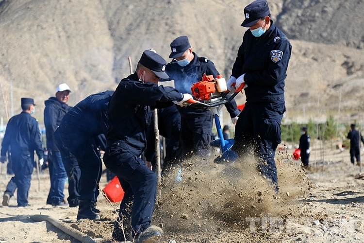 4月9日,民警們肩扛樹苗和鉆坑機(jī),手持鐵鍬和水桶,再次來到雅魯藏布江畔的沙漠地帶,開展義務(wù)植樹公益活動。