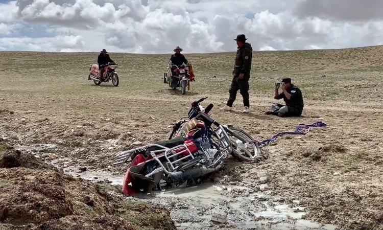 圖為陷在泥坑中的摩托車(chē) 圖片來(lái)源那曲廣播電視臺(tái)