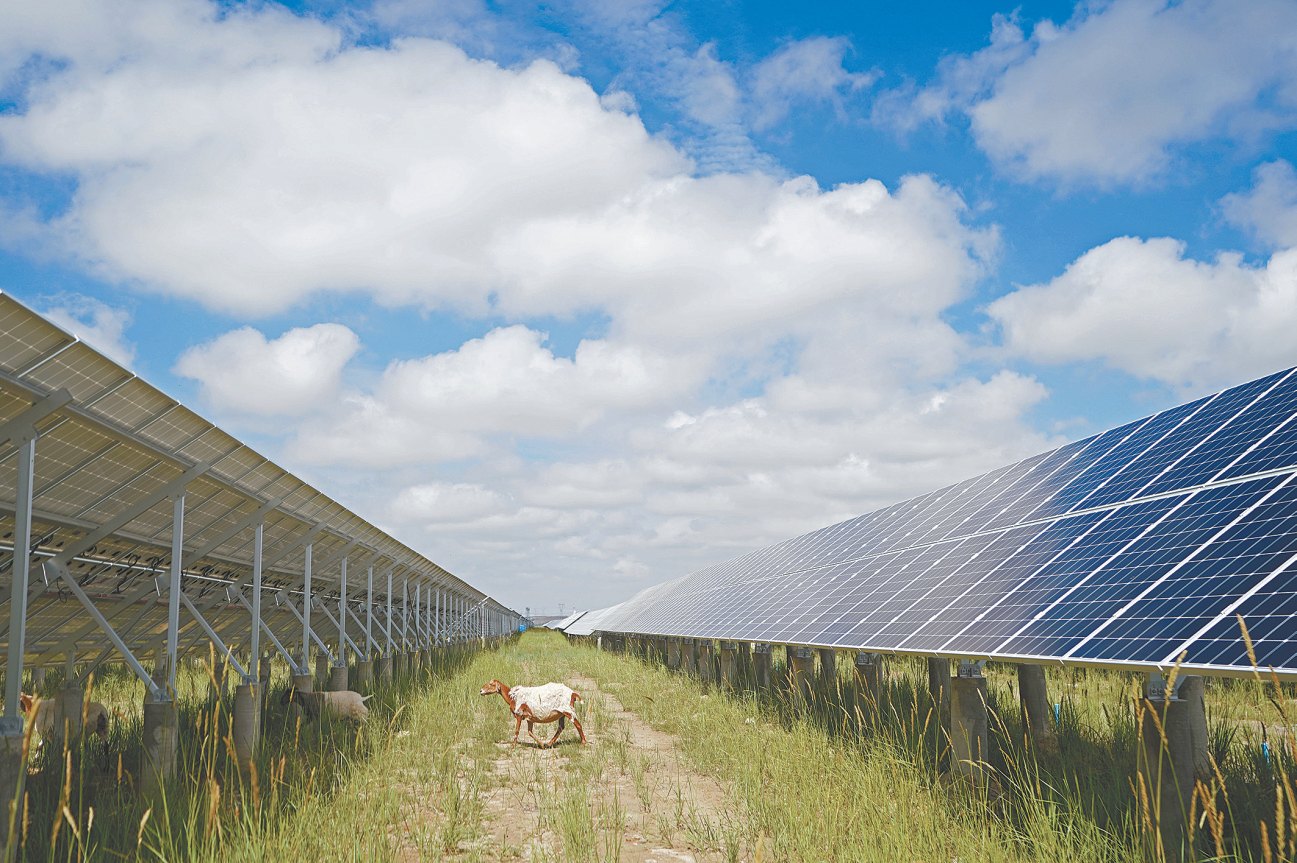 羊群在青海省海南藏族自治州共和縣塔拉灘的光伏發(fā)電基地休憩(8月5日攝)。邢廣利 攝