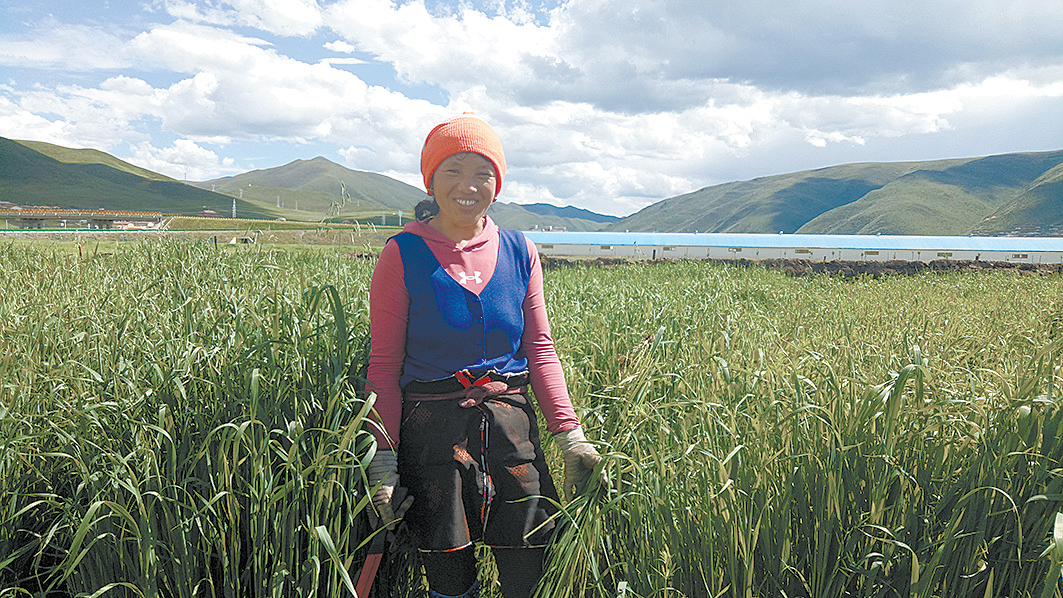 澤白是門堂鄉(xiāng)門堂村的貧困戶,家里有四口人,這些年,得益于草原補助、生態(tài)管護員等脫貧政策,澤白家于2016年脫貧。禁牧實施以來,澤白和丈夫種植了0.3公頃(五畝)草地早熟禾,當記者見到澤白時,她正在一片綠油油的田地間“揮舞”著鐮刀,身邊已有好幾摞割好的早熟禾。