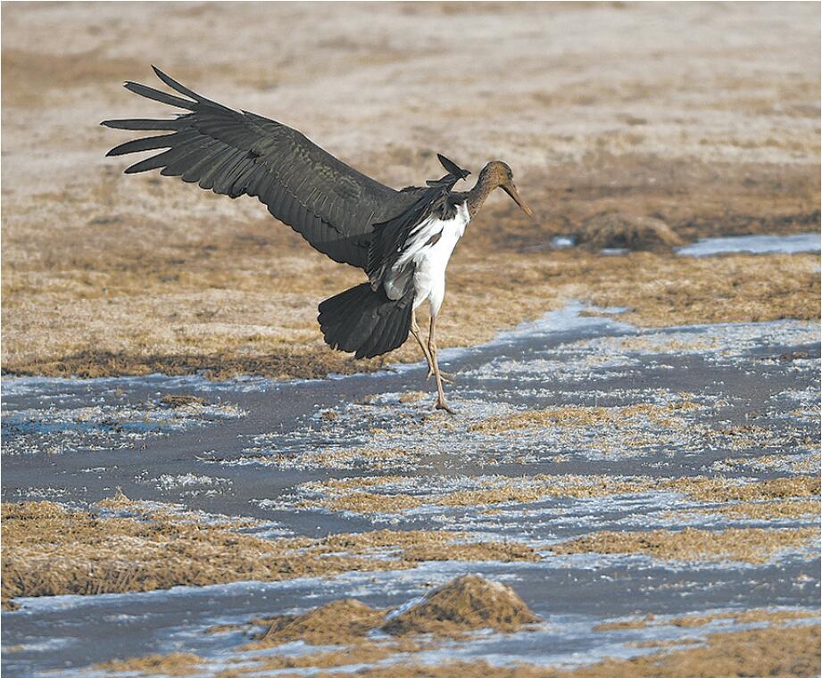 12月6日,一只黑鸛在西寧市北川河濕地公園內(nèi)嬉戲。近日,位于青海省西寧市的北川河濕地公園迎來兩只黑鸛。黑鸛屬鸛形目、鸛科,國家一級保護動物,目前全世界僅存3000只左右,屬于國寶級珍禽。新華社記者吳剛攝