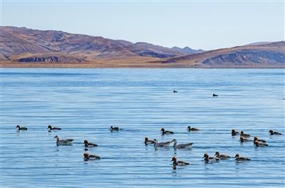 羊卓雍錯(cuò)自2014年被納入國(guó)家良好湖泊生態(tài)環(huán)境保護(hù)試點(diǎn)工程項(xiàng)目以來,羊卓雍錯(cuò)周邊生態(tài)環(huán)境持續(xù)向好,棲息繁衍的野生動(dòng)物數(shù)量逐年增多。這是近日拍攝的羊卓雍錯(cuò)湖面上的水鳥。新華社記者 孫非 攝