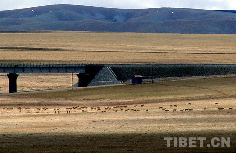 藏北高原,在藏語(yǔ)里稱(chēng)為“羌塘”。這里棲息著的藏羚羊,每年春夏季都會(huì)大規(guī)模由南向北長(zhǎng)距離遷徙,五道梁至楚瑪爾河一帶是必經(jīng)之路。為了保證藏羚羊自由遷徙,青藏鐵路在這里設(shè)立了四處野生動(dòng)物通道。其中長(zhǎng)11.7公里的清水河特大橋和長(zhǎng)4公里的楚瑪爾特大橋,采取“以橋代路”形式設(shè)計(jì)動(dòng)物通道,供野生動(dòng)物通過(guò)。