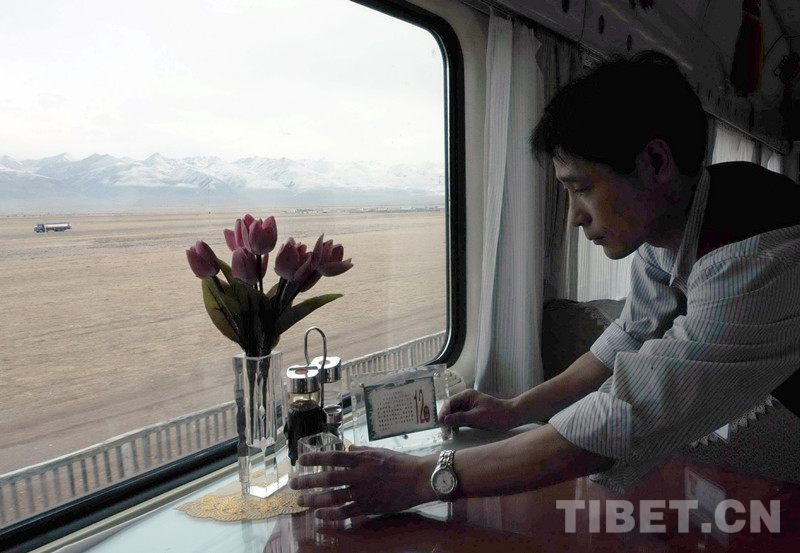 圖為全部為密封車(chē)窗,以防旅客投擲雜物。在通過(guò)藏北高原時(shí),一位餐車(chē)人員正在整理餐桌(唐召明2014年攝)