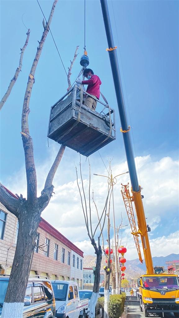 拉薩市園林相關(guān)單位對(duì)市區(qū)開展春季樹木修剪工作。