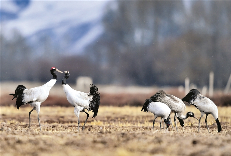圖為在西藏林周縣黑頸鶴自然保護區(qū)里棲息覓食的黑頸鶴。 新華社記者 張汝鋒攝