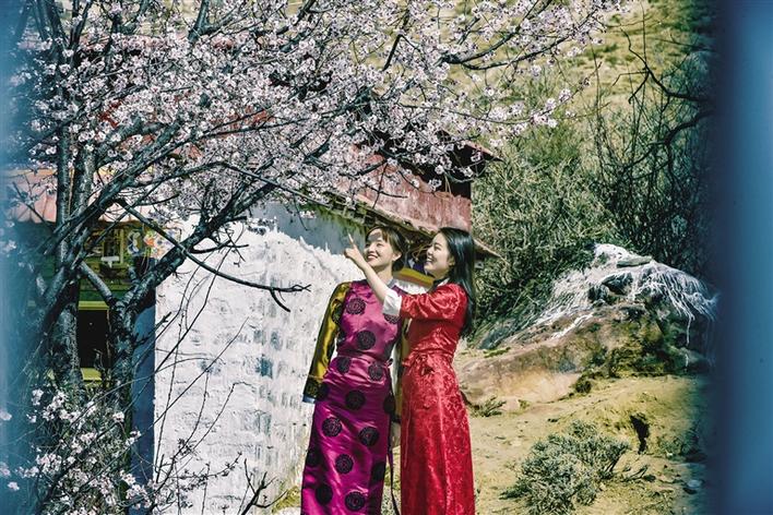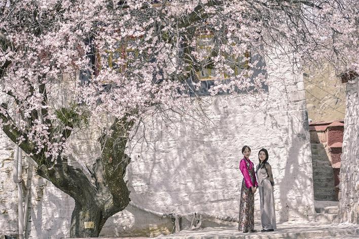 這里雖然沒有漫山遍野桃花次第盛開,但有花團(tuán)錦簇、桃紅柳綠,幾棵桃樹,一陣春風(fēng)吹過,花瓣如雨。身著藏裝的姑娘,與桃花合影,共赴春天的約會,看上去頗有些妖嬈的味道。